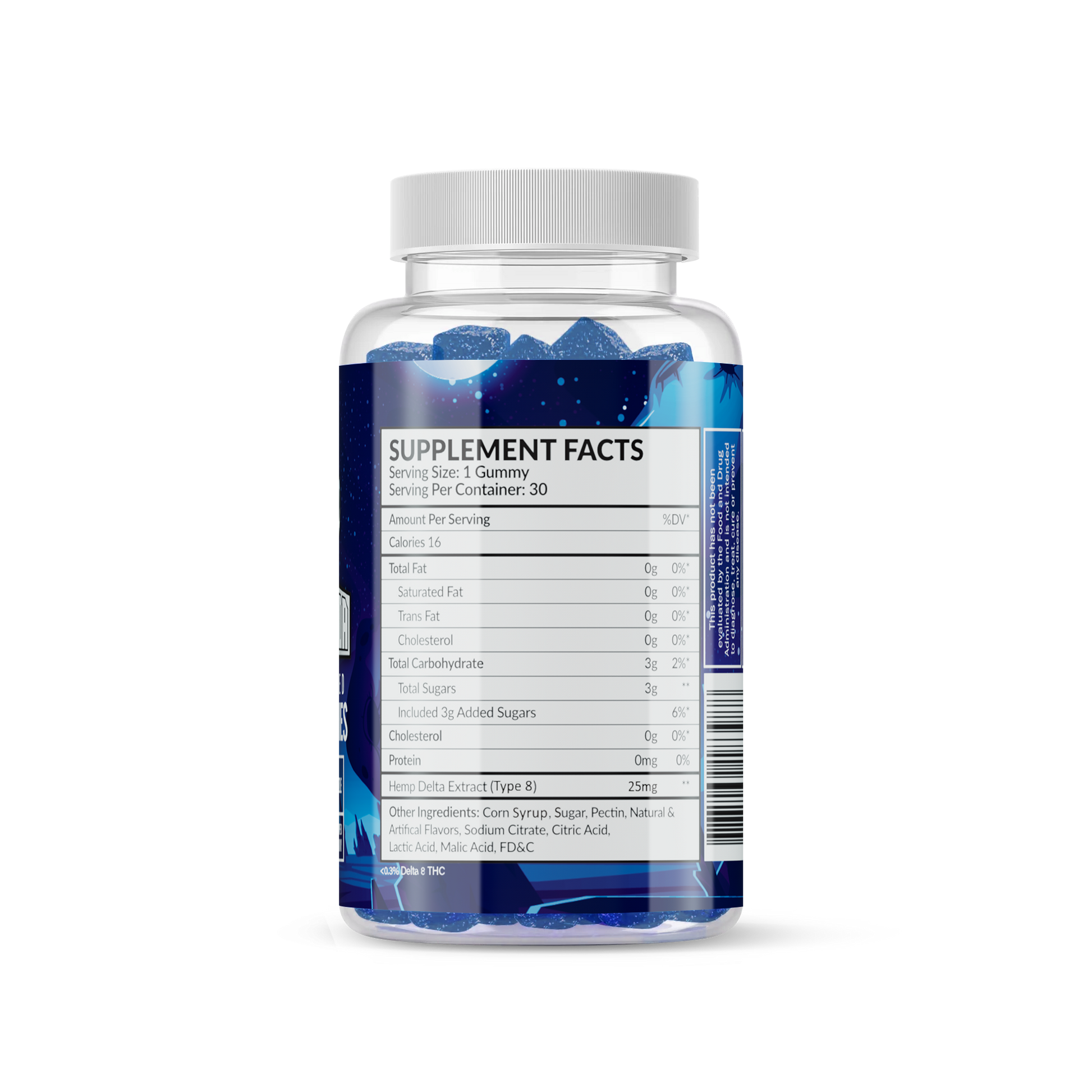 Ingredients: Hemp-derived Delta-8 : Corn Syrup, Sugar, Pectin, Natural and Artificial Flavors, Sodium Citrate, Citric Acid, Malic Acid, Lactic Acid, Paprika Oleoresin (Color)